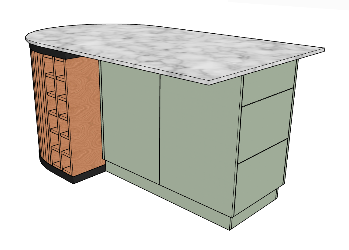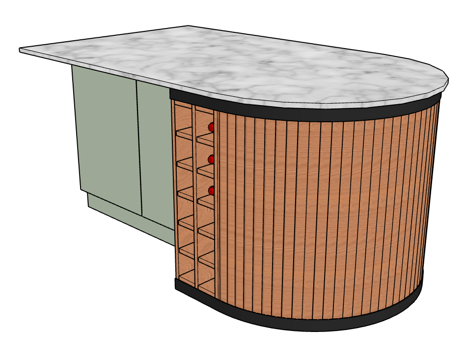 Kitchen island with Porta Tas Oak half dowel front, solid Tas oak wine racks and Laminex Bayleaf cabinetry. Stone provided by Stonelux Carrum Downs.